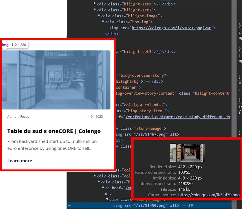 To counteract this issue, Colengo has developed standardized image pre-sets, optimizing the page speed. These sets are constructed on the back-end of your sales portal and integrated to the images on the front-end through hard-coding on the page layout. In practice, this attaches an image to its related set, allowing the image size (intrinsic) to adjusts accordingly to its image container (rendered).
