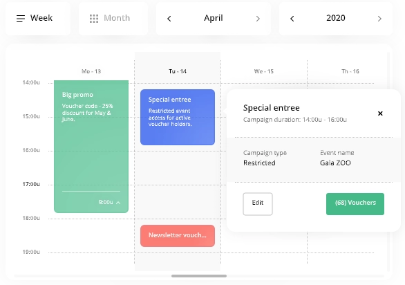 Limited campaigns work the same way as discount campaigns. When a new campaign has been created via the calendar view, it can be linked to the desired product execution. For this type of campaign, voucher codes are created. Vouchers give the possibility to provide access to select editions, as soon as a customer enters a voucher code, only the linked product editions will appear.