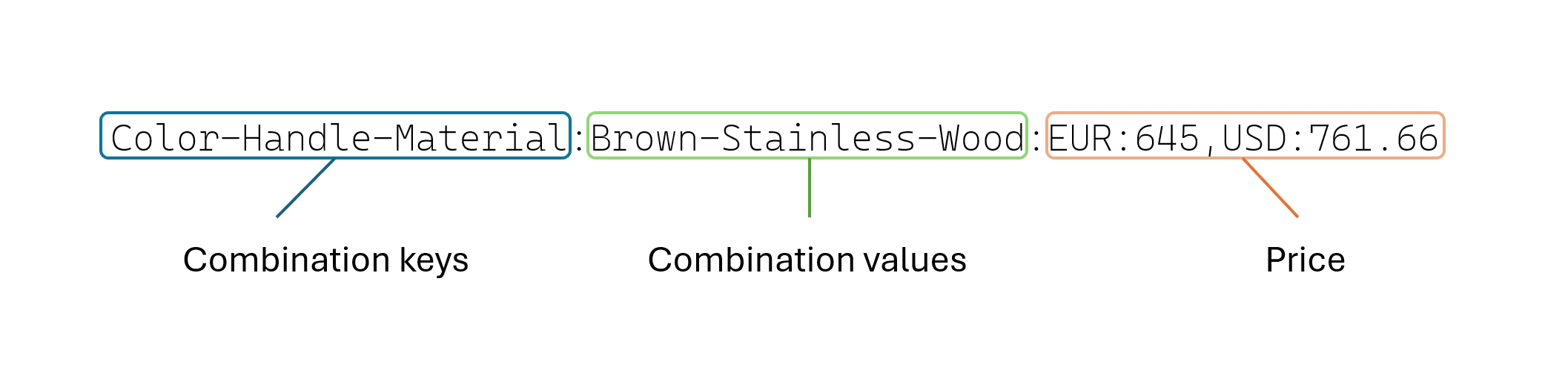 Each combination price file (.csv file) contains Combination prices which each record or row defines the combination keys, combination values and price.