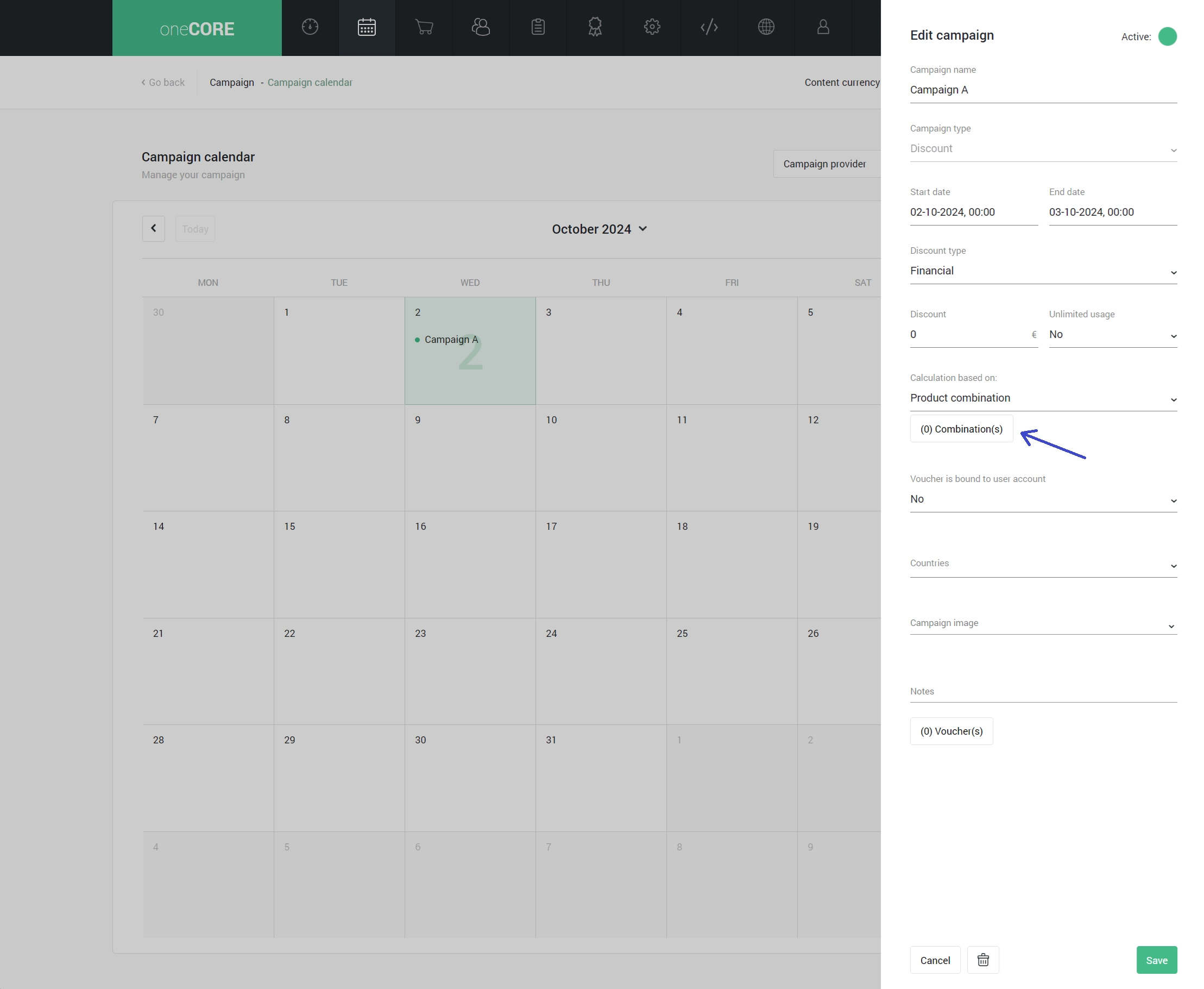 Among several campaign calculation rules, for example, total order price and every amount of all assigned products, 'Product combination' allows you to set up products which must be purchased together to be eligible for discount.