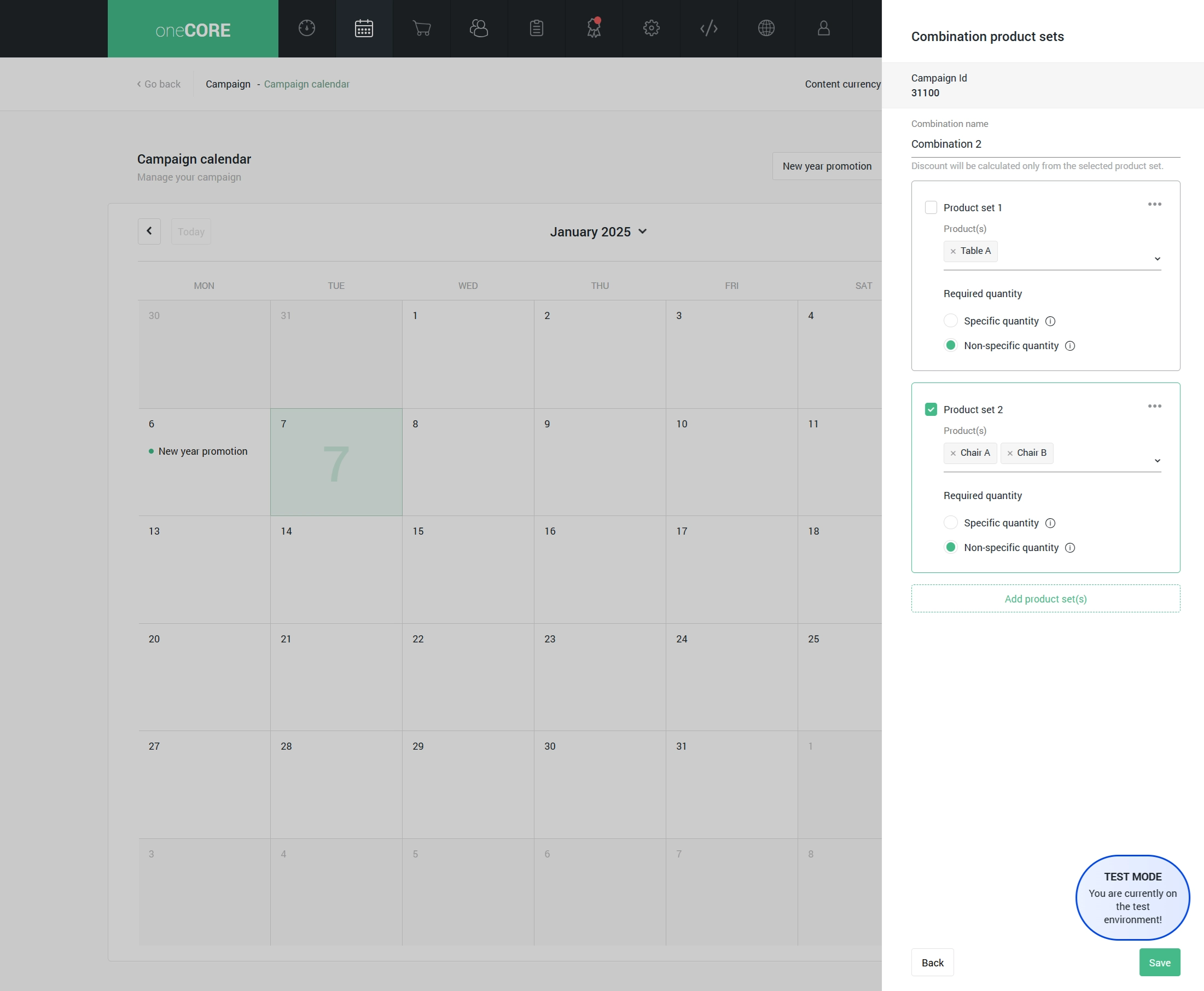 After you create a combination, it is time to create product sets to group eligible products. Customers must purchase one product from every product set of the required quantity, to qualify for the discount. The system pairs products from each set to form combinations. It prioritizes combinations that receive the highest discount, applying discounts to those combinations first. Then, if conditions are met multiple times within a single order (e.g., purchasing 4 units for a combination requiring 2), the discount can be applied multiple times also.