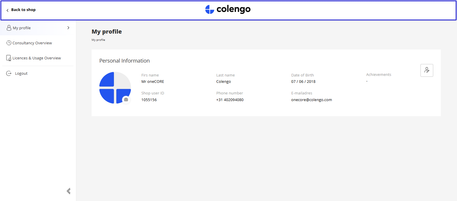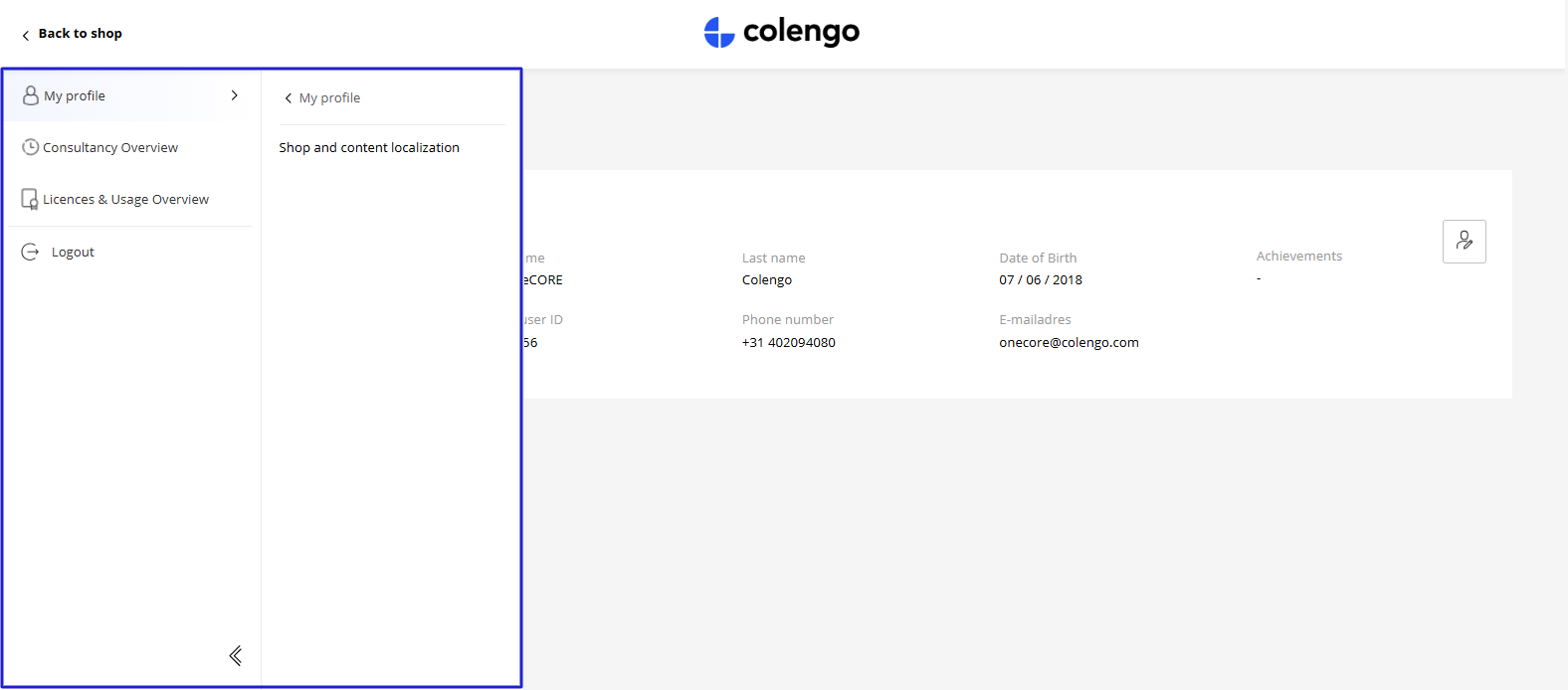 1. Header includes company logo and "Back to shop" button.